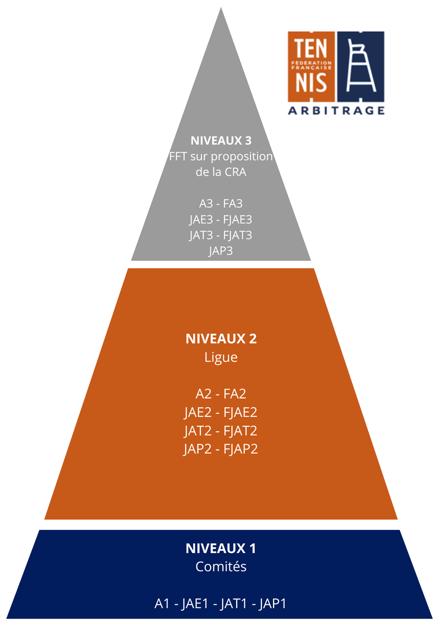 Ci-contre, une illustration de la pyramide des différentes qualifications des officiels de la compétition